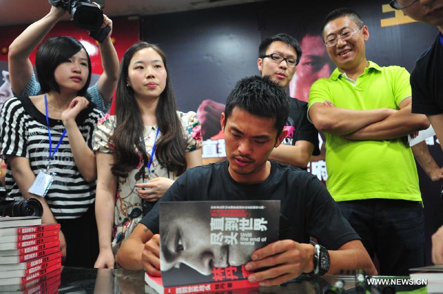 London Olympic Games badminton champion Lin Dan (C) signs books of his autobiography at the Wangfujing Bookstore in Beijing, capital of China, Aug. 12, 2012. (Xinhua/Liu Changlong)