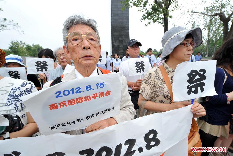 Members of the 16th delegation of "Connecting Cobe and Nanjing" Association from Japan attend the assembly to mourn for the victims in the tragic Nanjing Massacre by Japanese Invaders and pray for world peace at the Peace Square in Nanjing, capital of east China's Jiangsu Province, Aug. 15, 2012. The day August 15 is the 67th anniversary of the Japanese declaration of unconditional surrender and the victory day of both Chinese people's anti-Japanese war and the world's anti-Fascist war. The 27th delegation of the "Engraved Memory" Association, the 16th delegation of "Connecting Cobe and Nanjing" Association, and the 10th Nagasaki "Wing of Hope" Japanese-Chinese Delegation from Japan took their special trip to Nanjing to attend the assembly. (Xinhua/Han Yuqing)