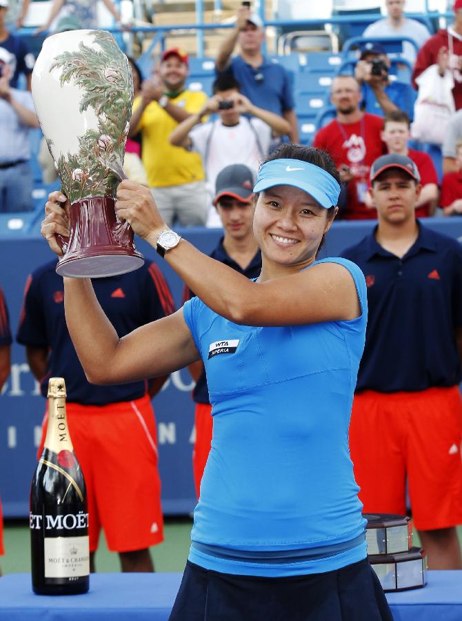 Li Na of China holds up the championship trophy after defeating Angelique Kerber of Germany at the women's Cincinnati Open tennis tournament in Cincinnati, Ohio August 19, 2012. (Xinhua/Reuters Photo)