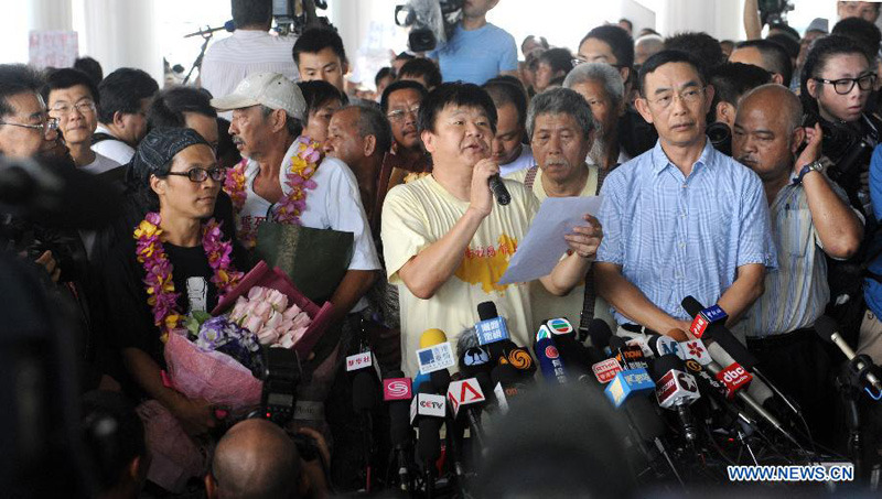 Chinese activists who were illegally detained by Japan meet the media at Tsim Sha Tsui Ferry Pier after returning to south China's Hong Kong, August 22, 2012. The seven Chinese activists illegally detained by Japan for landing on the Diaoyu Islands returned to Hong Kong on Wednesday afternoon. (Xinhua/Lui Siu Wai)