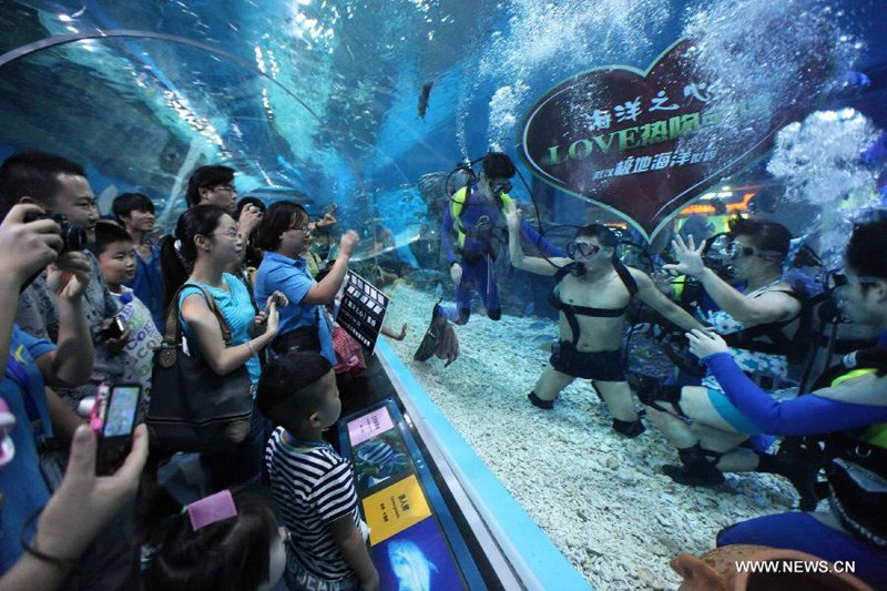 Visitors view an activity attended by young couples at the sea world in Wuhan, capital of central China's Hubei Province, Aug. 22, 2012. Seven couples dived into water and kissed each other in a sea world in Wuhan, as a romantic method to celebrate the upcoming Chinese Valentine's Day, or Qixi Festival, which falls on Aug. 23 this year. (Xinhua/Wang Zhenwu)