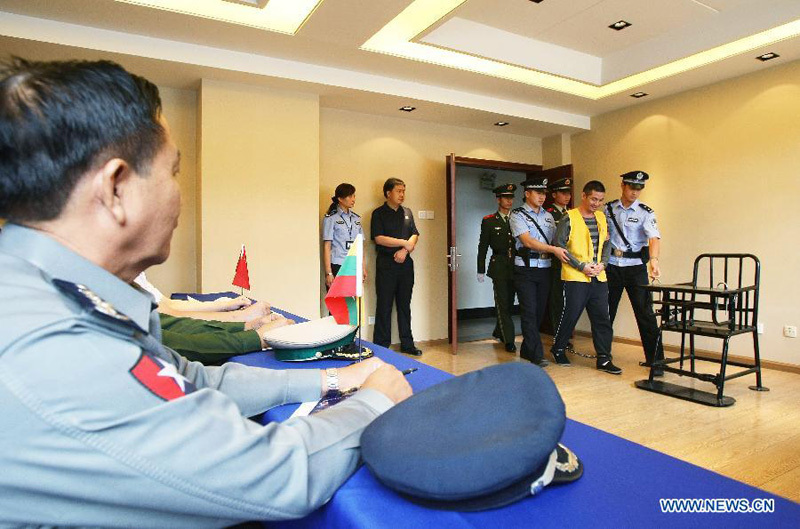 Naw Kham (2nd R), a drug lord suspected of masterminding the murders of 13 Chinese sailors on Oct. 5, 2011, is brought to an interrogation held by Chinese and Myanmar military and police officers in Kunming, capital of southwest China's Yunnan Province, Aug. 22, 2012. A team of Myanmar military and police officers arrived Wednesday in Kunming to interrogate Naw Kham, who is believed to be associated with the Mekong River murders in October 2011, at the invitation of China's Ministry of Public Security. (Xinhua/Li Fangyu)