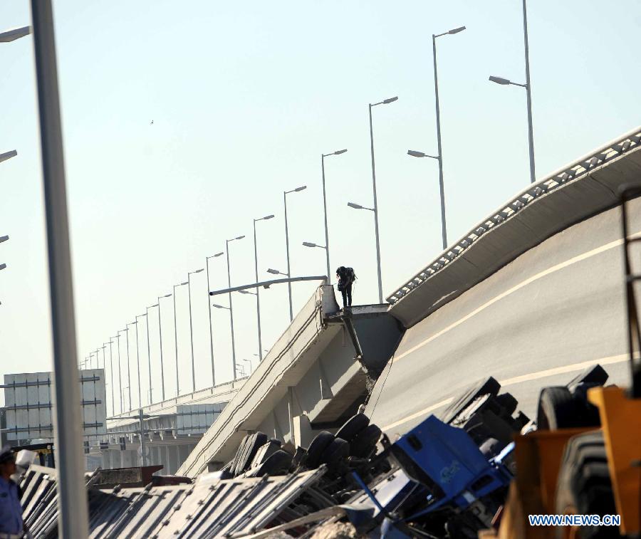 Photo taken on Aug. 24, 2012 shows the collapsed section of the Yangmingtan bridge in Harbin, capital of northeast China's Heilongjiang Province. Four trucks fell off to the ground after a section of the Yangmingtan bridge collapsed in Harbin early Friday morning, killing three people and injuring five others. The 15.4-kilometer-long bridge was opened to traffic last November. The collapsed part, which measures 100 meters in length, fell from a height of 30 meters. (Xinhua/Wang Song)