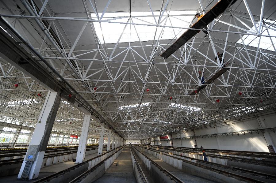 Platelayers work at a subway car depot of subway Line 1 in Xi'an City, capital of northwest China's Shaanxi Province, Aug. 28, 2012. The rail laying of subway Line 1 is expected to be completed on Wednesday, and the 25.36-kilometer-long subway will be put into service in September of next year. (Xinhua/Hao Tongqian)