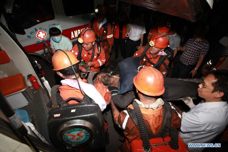 Rescuers carry an injured miner to an ambulance after a coal mine explosion in Xiaojiawan Coal Mine in Panzhihua City, southwest China's Sichuan Province, Aug. 30, 2012. The death toll in a gas explosion that occurred Wednesday afternoon at the coal mine has climbed to 19 and 28 others remain missing. A total of 154 miners were working underground at the Xiaojiawan Coal Mine when the blast occurred. (Xinhua)