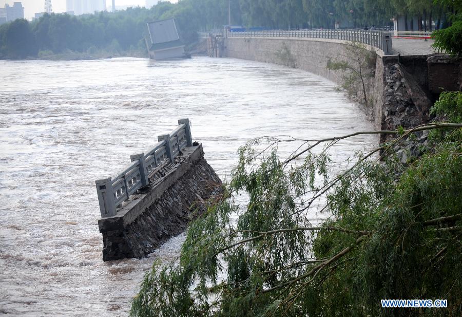 Photo taken on Aug. 30, 2012 shows the collapsed dike on the Yellow River in Lanzhou, capital of northwest China's Gansu province. A 100-meter section of a dike on the Yellow River collapsed Wednesday evening, severing water pipes and affecting the availability of tap water. No casualties have been reported. Repair work on the pipes is under way. (Xinhua/Zhang Meng)