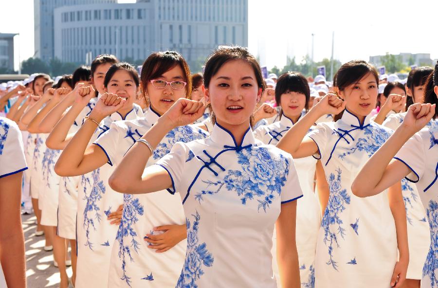 Volunteers attend an inauguration ceremony before the sixth Annual Meeting of the New Champions in Tianjin, north China, Sept. 5, 2012. The sixth Annual Meeting of the New Champions, also known as the Summer Davos Forum, will be held in Tianjin on Sept. 11, 2012. (Xinhua/Zhang Chaoqun)
