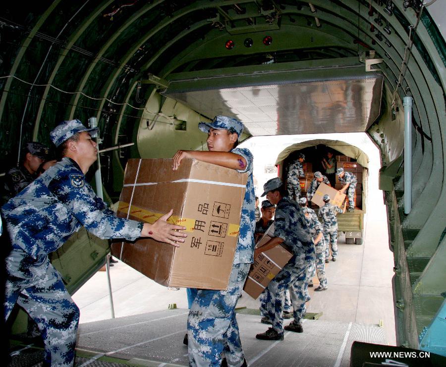 Officers and soldiers of PLA Chengdu Military Area Command load quake-relief materials at an airport in Chengdu, southwest China's Sichuan Province, Sept. 9, 2012. Multiple earthquakes struck Yiliang County and neighboring areas in southwest China's Yunnan Province on Friday, killing at least 81 people. The PLA Chengdu Military Area Command has bridged an air lifeline, sending 13 tons of quake-relief materials and transfering three severely wounded people so far. (Xinhua/Chen Han)