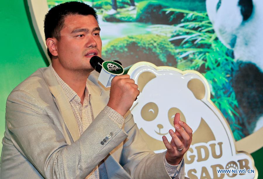 Yao Ming attends a launch ceremony of the "Global Search for Chengdu Pambassador 2012" in Chengdu, capital of southwest China's Sichuan Province, Sept. 10, 2012. The event, connected with the Yao Foundation, was held to recruit three volunteers in worldwide range to carry out activities to protect giant pandas. (Xinhua/Jiang Yuezhou)