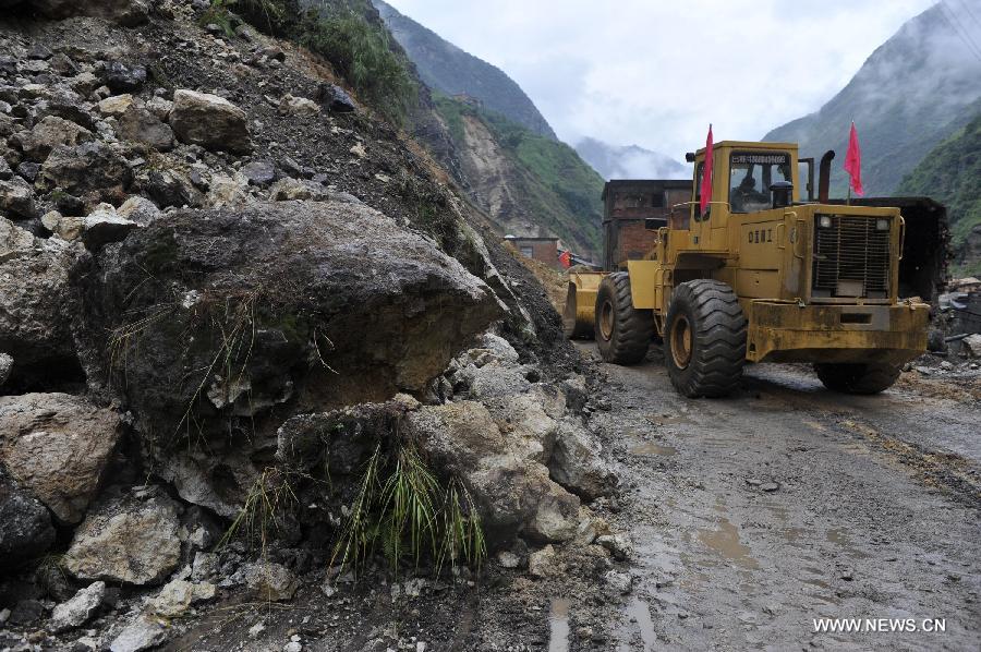 An excavator works to restore traffic in a landslide-affected section of a road leading to quake-hit Luozehe Township, in Yiliang County, Zhaotong City, southweat China's Yunnan Province, Sept. 11, 2012. A heavy downpour has hit Yiliang early Tuesday morning, triggering floods to cut off roads and force thousands to evacuate. Landslide and mud-rock flows triggered by the rain also aggravated the disaster relief work in Yiliang, where multiple earthquakes have claimed 81 lives since Sept. 7. (Xinhua/Ou Dongqu)