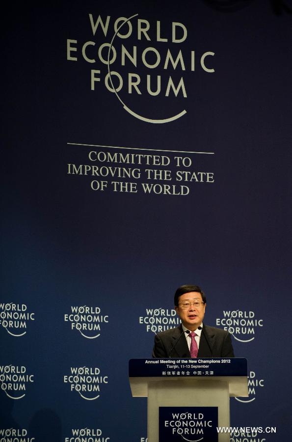 Huang Xingguo, Mayor of Tianjin, delivers a speech during the closing ceremony of the World Economic Forum Annual Meeting of the New Champions 2012, also known as the Summer Davos Forum, in Tianjin, north China, Sept. 13, 2012. The three-day Summer Davos Forum ended here Thursday. (Xinhua/Yue Yuewei)