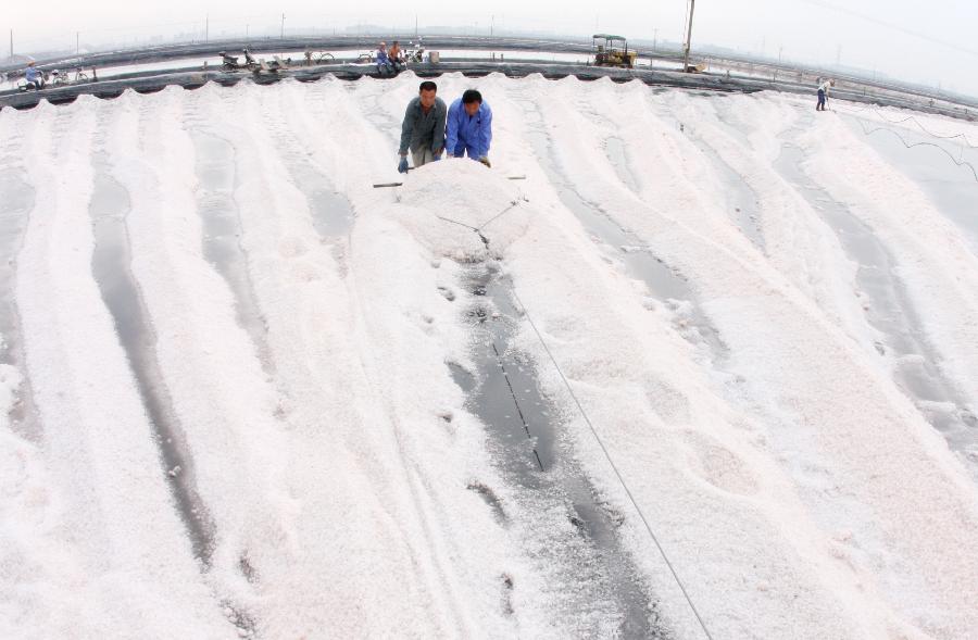 Workers harvest crude salt in Lianyungang, east China's Jiangsu Province, Sept. 19, 2012. Covering an area of about 3,3000 hectares, the salt fields in Lianyungang witnessed the harvest season recently. (Xinhua/Geng Yuhe)