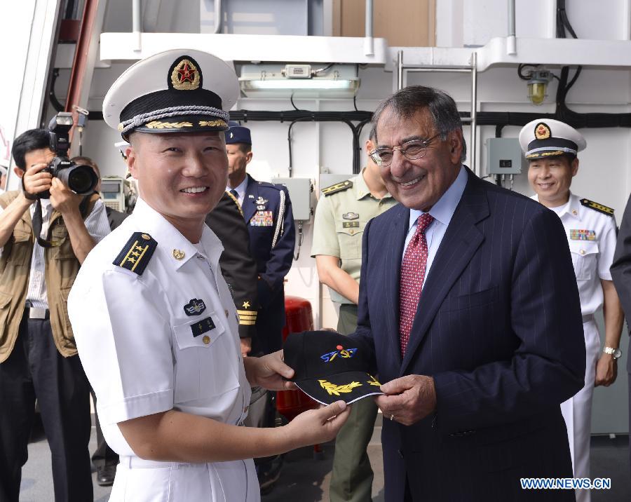 U.S. Secretary of Defense Leon Panetta (R, front) receives a souvenir as he visits the frigate "Yantai" in Qingdao, east China's Shandong Province, Sept. 20, 2012. Panetta visited the Headquarters of China's North Sea Fleet and toured Chinese naval vessels on Thursday. (Xinhua/Wang Ye)