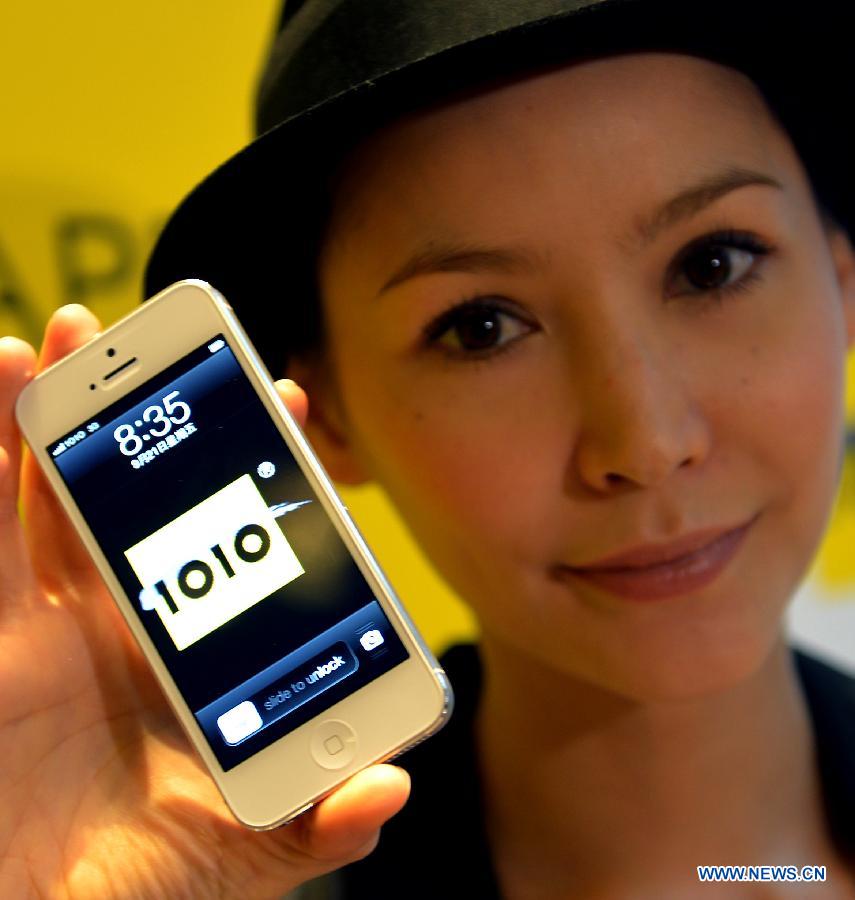 A customer shows an iPhone 5, the lastest version of Apple Inc's smartphone, in south China's Hong Kong, Sept. 21, 2012. The iPhone 5 started selling in Hong Kong on Friday. (Xinhua/Chen Xiaowei)