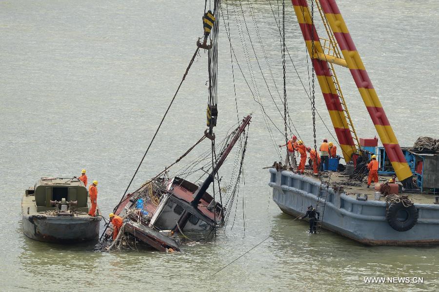 Workers salvage a sunken fishing boat on the water area between Xiwan Bridge and Ponte Governador Nobre de Carvalho in Macao, south China, Sept. 23, 2012. The fishing boat sunk after crashing with a cargo ship Saturday night, killing three people. (Xinhua/Cheong Kam Ka)