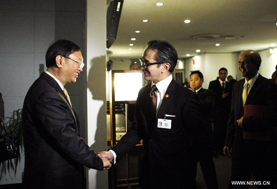Chinese Foreign Minister Yang Jiechi (L) meets with Indonesia Foreign Minister Marty Natalegawa at the United Nations headquarters in New York on the sidelines of the 67th UN General Assembly, on Sept. 24, 2012. (Xinhua/Fang Zhe)