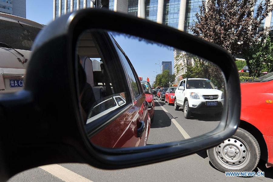 Photo taken on Sept. 27, 2012 shows vehicles stuck in a traffic jam reflected by a rear mirror of a taxi in Taiyuan, capital of north China's Shanxi Province. The coming of Mid-Autumn Festival and Chinese National Day increased traffic jams in Taiyuan. (Xinhua/Zhan Yan)