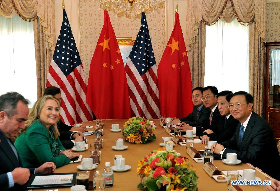 Chinese Foreign Minister Yang Jiechi (R) meets with U.S. Secretary of State Hillary Clinton on the sidelines of the 67th session of the UN General Assembly in New York, the United States, Sept. 27, 2012. (Xinhua/Wang Lei)