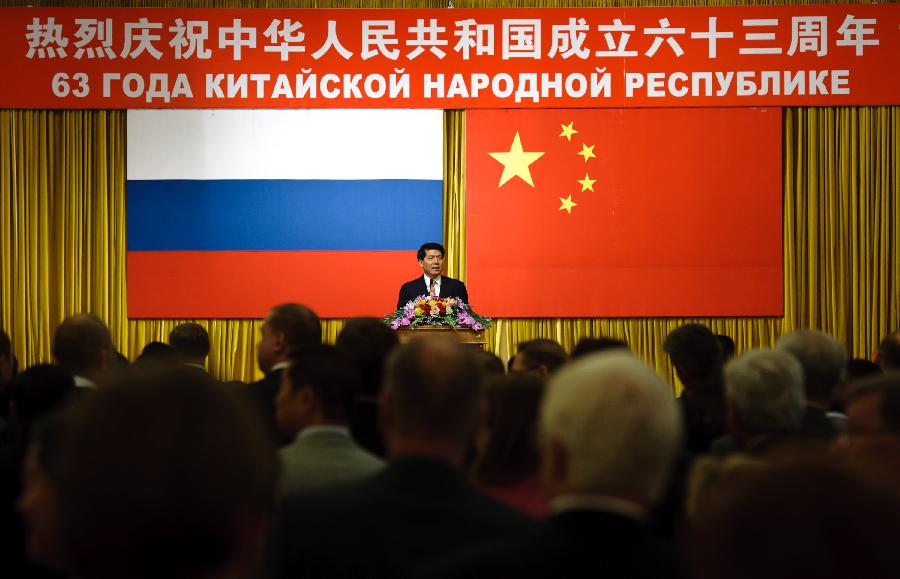 Chinese ambassador to Russia Li Hui delivers a speech at the reception marking the 63rd anniversary of the founding of the People's Republic of China, in Moscow, Russia, Sept. 27, 2012. (Xinhua/Jiang Kehong)