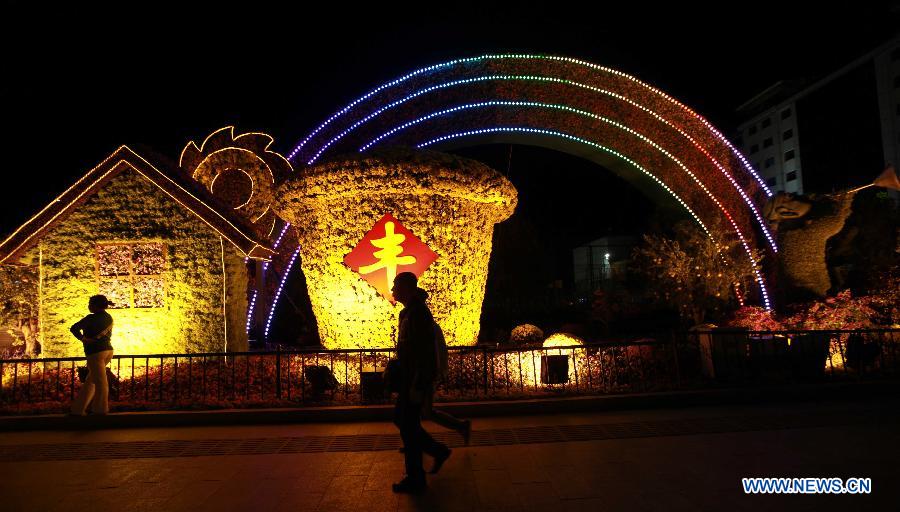 Citizens walk past the flower decorations in Beijing, capital of China, Sept. 28, 2012. Flowers are laid on the city's streets and squares to greet the upcoming National Day on Oct. 1. (Xinhua/Liang Zhiqiang)