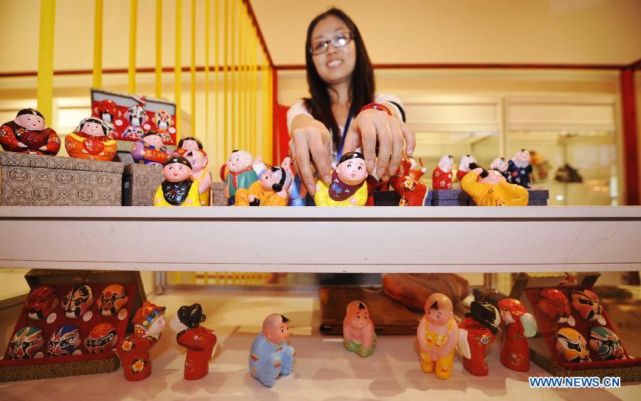 An exhibitor shows off mud statuettes, art works by "Niren Zhang", or Clay Figure Zhang, a time-honored mud statuette brand that began its business in 19th century, during an exhibition showcasing Chinese intangible cultural heritage in Tianjin, north China, on Sept. 28, 2012. (Xinhua/Yue Yuewei)