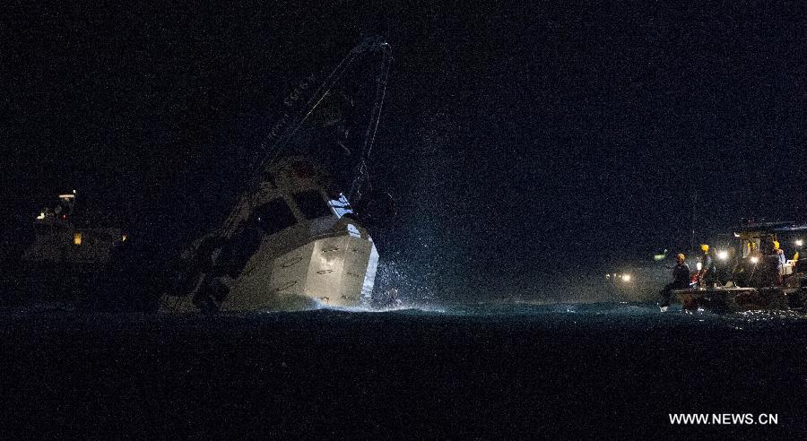 Rescuers get close to a partially-submerged vessel after a collision in Hong Kong, south China, Oct. 2, 2012. The death toll of a ship collision took place on Monday in Hong Kong rose to 36 as of 7:45 a.m. Tuesday, Hong Kong's Information Services Department said in an updated statement. (Xinhua/Lui Siu Wai)