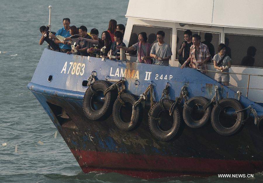 Relatives of victims throw paper scraps which symbolize money as they mourn for the dead at the site where two vessels collided off the Lamma Island on the southwest of the Hong Kong Island, the Hong Kong Special Administrative Region (HKSAR), south China, Oct. 2, 2012. Thirty-eight people including five children were killed by the accident, the HKSAR government said Tuesday evening. (Xinhua/Lui Siu Wai)
