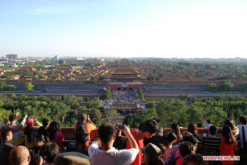Tourists visit the Jingshan Park in Beijing, capital of China, Oct. 3, 2012. China's "Golden Week" holiday justified its title with a rise in tourism revenue, National Tourism Administration (NTA) statistics showed Sunday. The country's 119 major scenic spots received a total of 34.25 million visitors during the eight-day holiday, up 20.96 percent from the corresponding period last year. Tourism income surged by nearly a quarter from 2011 to 1.77 billion yuan (278.39 million U.S. dollars), the NTA said. (Xinhua/Wang Junfeng)