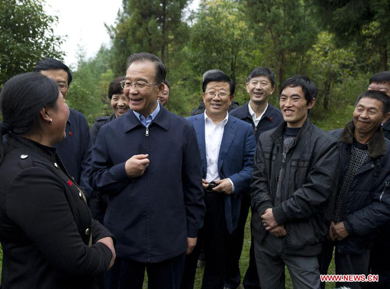 Chinese Premier Wen Jiabao (2nd L) talks with a villager at Yangquegou Village in Bijie City, southwest China's Guizhou Province, Oct. 6, 2012. Wen paid an inspection tour to Bijie City from Oct. 6 to 7.(Xinhua/Li Xueren)