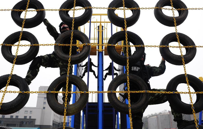 Coast guards take part in a training session in Dalian, a coastal city in northeast China's Liaoning Province, Oct. 9, 2012. (Xinhua/Jiang Bing)