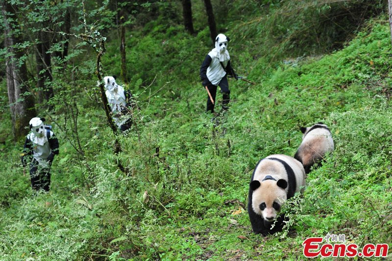 Researchers wear panda costumes to ensure that the cub's environment is devoid of human influence, October 8, 2012. After transferred to a bigger living environment with a higher altitude and a more complicated terrain for five months, giant panda Tao Tao, 26 months old, has finished the third phase of its training to be reintroduced to the wild, scheduled on October 11, 2012. [Photo: CNS/Zhong Xin]