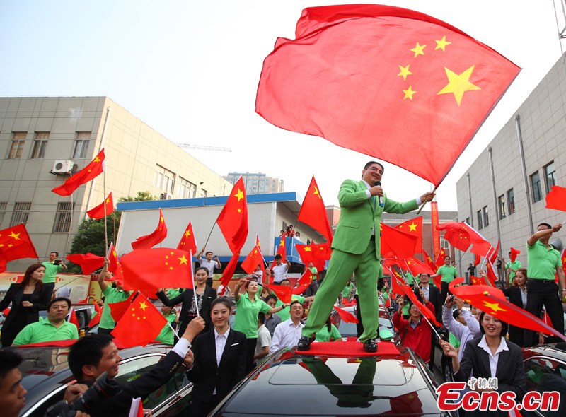 Chen Guangbiao, a 44-year-old Chinese billionaire and philanthropist, holds a ceremony on Wednesday afternoon in Nanjing, Jiangsu Province, to give away 43 new domestic cars to people whose Japanese-brand cars were damaged during nation-wide protests against Japan's "nationalization" of the Diaoyu Islands in the East China Sea last month. [Photo: CNS/Yang Bo]