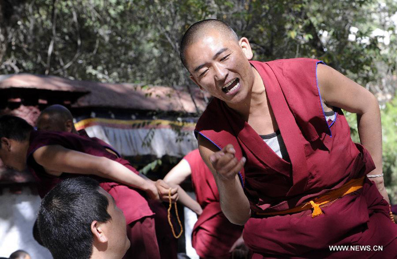 A lama debates on the sutra of Tibetan Buddhism at the Sera Monastery in Lhasa, capital of southwest China's Tibet Autonomous Region, Oct. 8, 2012. The Sera Monastery, one of the three leading monasteries in Lhasa, holds Tibetan Buddhism sutra debate every afternoon except Sunday. (Xinhua/Chogo)