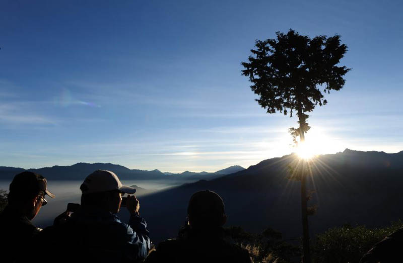 Tourists watch the sunrise at the Zhushan section of the Ali Mountain scenic area in southeast China's Taiwan Oct. 12, 2012. (Xinhua/Yin Bogu)