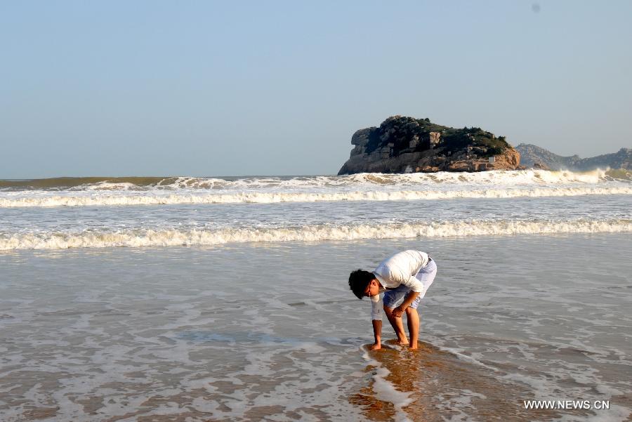 A tourist plays on the beach of the Nanji Island, east China's Zhejiang Province, Oct. 14, 2012. The 7.64-square kilometer Nanji Island, as the largest island of the Nanji Islands, was named for its muntjac shape. The archipelago were listed as China's first level-five marine nature reserve in 1990. (Xinhua/Yang Jinzhi)