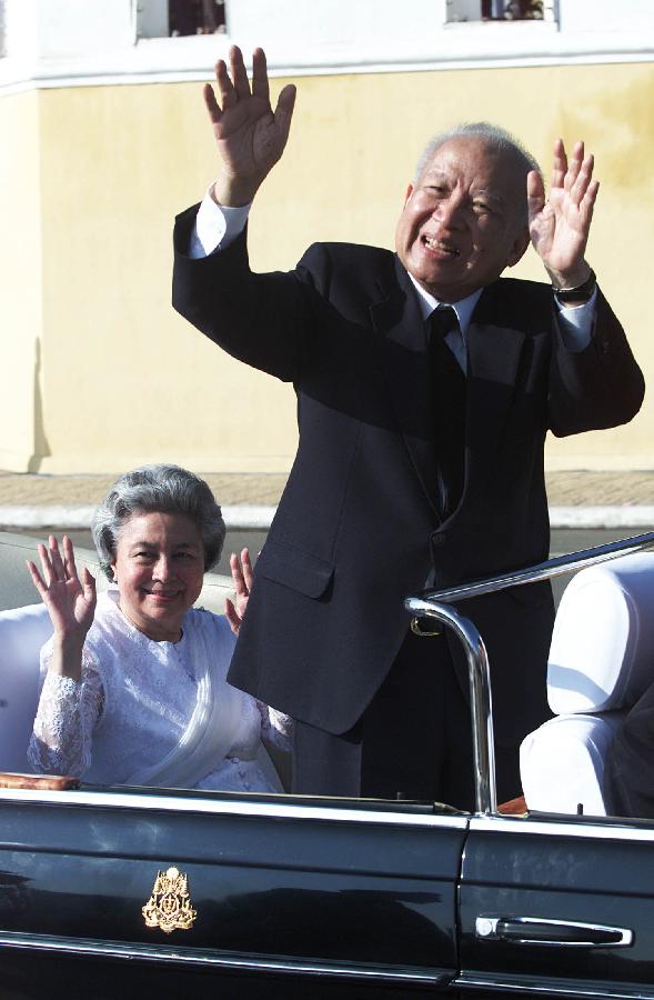 File photo taken on Nov. 9, 2003 shows Norodom Sihanouk greeting people in an activity celebrating the 50th anniversary of Cambodia's independence in Phnom Penh. Cambodian retired King Norodom Sihanouk died of natural cause at the age of 90 in China's capital city of Beijing, where he had his diseases treated by Chinese doctors, Cambodian Deputy Prime Minister Nhik Bun Chhay confirmed on Oct. 15, 2012. (Xinhua)