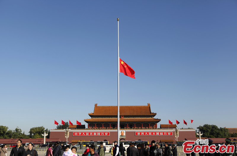 The national flag at Tiananmen Square has been lowered to half-mast in honor of Sihanouk, October 17, 2012. The same day, a convoy bearing the body of late Cambodian king departed from the Beijing hospital where he passed away this week en route back to his homeland. [Photo: CNS/Liu Guanguan]