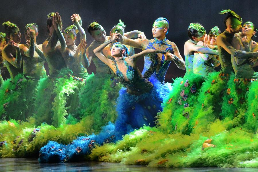 Dancer Yang Liping (6th R) performs dance drama "peacock" in north China's Tianjin Municipality, Oct. 18, 2012. (Xinhua/Wang Xiaoming)