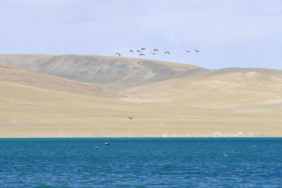 Birds fly over the Bam Co lake in Nagqu prefecture, southwest China's Tibet Autonomous Region, Oct. 19, 2012. (Xinhua/Liu Kun)