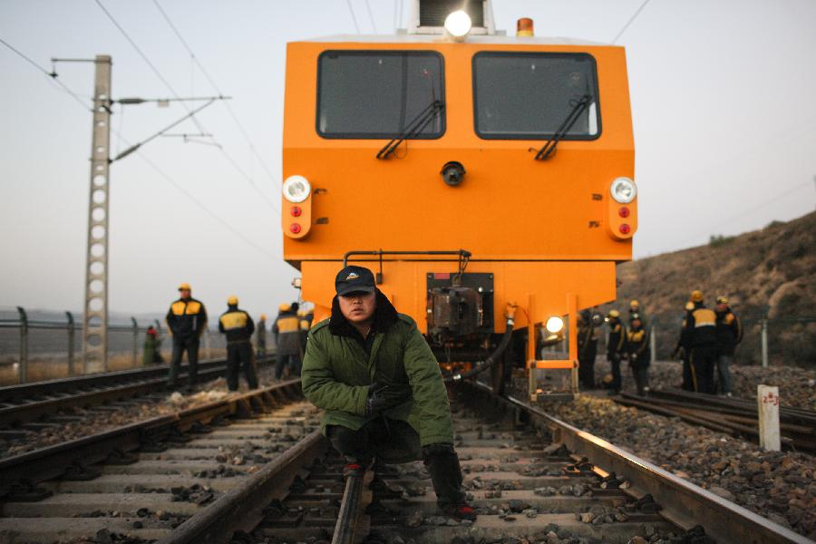 A worker checks tamped rails at Sandaoying Station of Beijing-Baotou Railway (Jingbao Railway) in Zhuozi County, north China's Inner Mongolia Autonomous Region, Oct. 19, 2012. A nine-day maintenance and construction project of Jingbao railway during the night, which involving more than 280 workers, started on the early morning of Friday. (Xinhua/Zhang Fan)