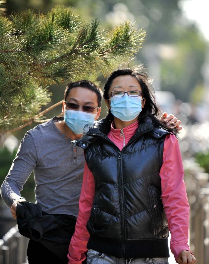 Pedestrians walk in the wind on the commercial street of Wangfujing in downtown Beijing, capital of China, Oct. 22, 2012. Beijing saw the strong wind and the temperature drop on Monday, as a cold front swept north China. (Xinhua/Li Wen)