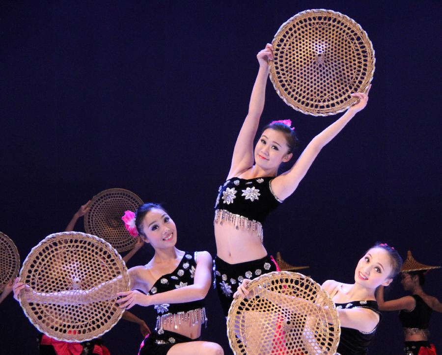 Chinese dancers perform during the Chinese Culture Day to mark the 20th anniversary of the establishment of diplomatic relations between Uzbekistan and China, in Tashkent, Oct. 21, 2012. (Xinhua/Dong Longjiang)