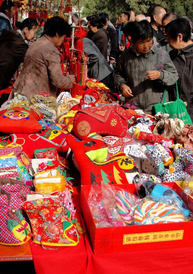 People select handicrafts at Chongyang bazzar in Jinan, capital of east China's Shandong Province, Oct. 22, 2012. The annual Chongyang bazaar, which lasts from Oct. 20, 2012 to Oct. 28, 2012 at the scenic region of Qianfo Mountain, or the Thousand Buddha Mountain in Jinan, attracted lots of people to come for sightseeing and shopping for special local products as well as handicrafs. The Chongyang Festival is a traditional Chinese holiday which falls on Sept. 9 each year in Chinese lunar calendar. (Xinhua/Xu Suhui)