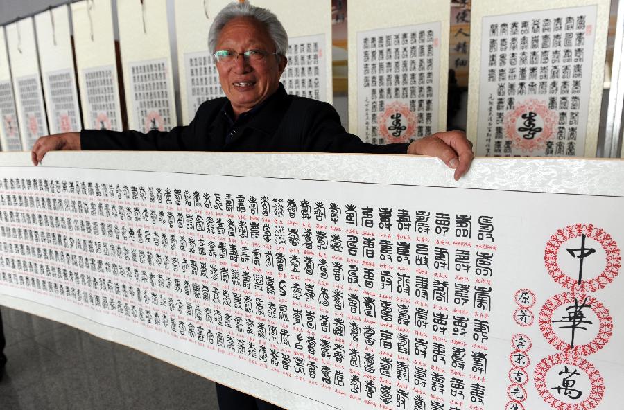Cui Xinghua, a 74-year-old retired teacher, presents his calligraphy of 10,278 Chinese characters of "Shou", meaning longevity, in Pingdu City, east China's Shandong Province, Oct. 23, 2012. The calligraphy work took Cui five months to accomplish. (Xinhua/Li Ziheng)