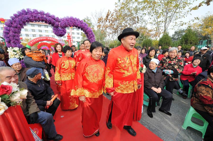 Couples who have been married for 50 years walk on the red carpet during a golden and silver wedding anniversary to greet the Double Ninth Festival in the Helan County of northwest China's Ningxia Hui Autonomous Region, Oct. 23, 2012. The Double Ninth Festival, or Chongyang Festival, is a traditional Chinese holiday to pay respect to the seniors. (Xinhua/Peng Zhaozhi)
