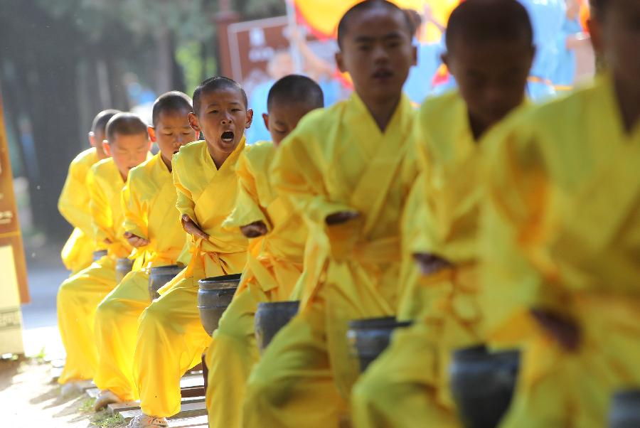 Young students of kungfu school perform during a welcoming ceremony of the 9th Zhengzhou International Shaolin Wushu Festival in Dengfeng City, central China's Henan Province, Oct. 22, 2012. A series of performance as well as Wushu contest and seminar will be held during the festival from Oct. 21 to 25. (Xinhua/Chen Xiaodong)