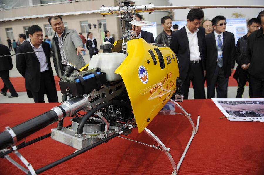 Visitors look at the unmanned aerial vehicles (UAV) displayed during a demonstration event of the UAV achievements in Yinchuan, capital of northwest China's Ningxia Hui Autonomous Region, Oct. 23, 2012. Nineteen UAVs were demonstrated during the event kicked off on Monday. The UAV technology has been applied to investigate the condition of agriculture, forestry, land resources, and water resources in Ningxia. (Xinhua/Wang Peng)
