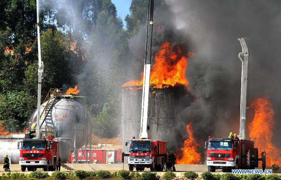 Firefighters hose down fire during a fire fighting drill held in the outskirt of Kunming, capital of southwest China's Yunnan Province, Oct. 25, 2012. (Xinhua/Chen Haining)