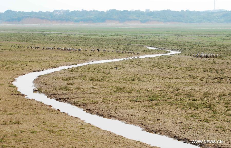 Photo taken on Oct. 25, 2012 shows the dried-up lake bed of Poyang Lake nearby the Xingzi county in Jiujiang city of east China's Jiangxi Province. China's largest freshwater lake, Poyang Lake, has seen a low water level in recent days, with the water-surface area shrinking from this year's record of 3,990 square km to the current 1,060 square km. (Xinhua/Hu Guolin)