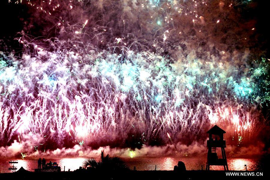 Fireworks explode in the sky during the Jinshan International Beach Music Fireworks Festival held in Shanghai, east China, Oct. 28, 2012. The event showcased fireworks from China, Belgium, Portugal and United States. (Xinhua/Zhuang Yi)